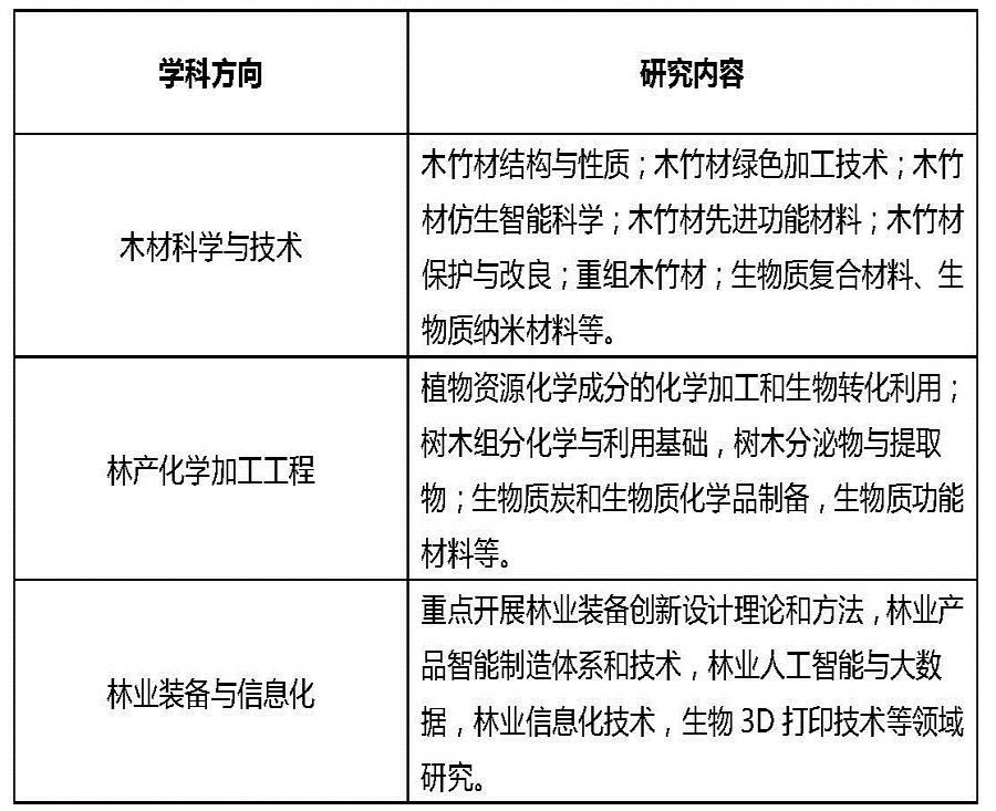 本学科拥有国家木质资源综合利用工程技术研究中心、“亚热带森林资源培育与高效利用”国家111引智计划、省部共建“竹业科学与技术”教育部重点实验室、浙江省木材加工产业科技创新服务平台、浙江省竹资源与高效利用2011协同创新中心、林业感知技术与智能装备国家林业局重点实验室等11个科研平台。