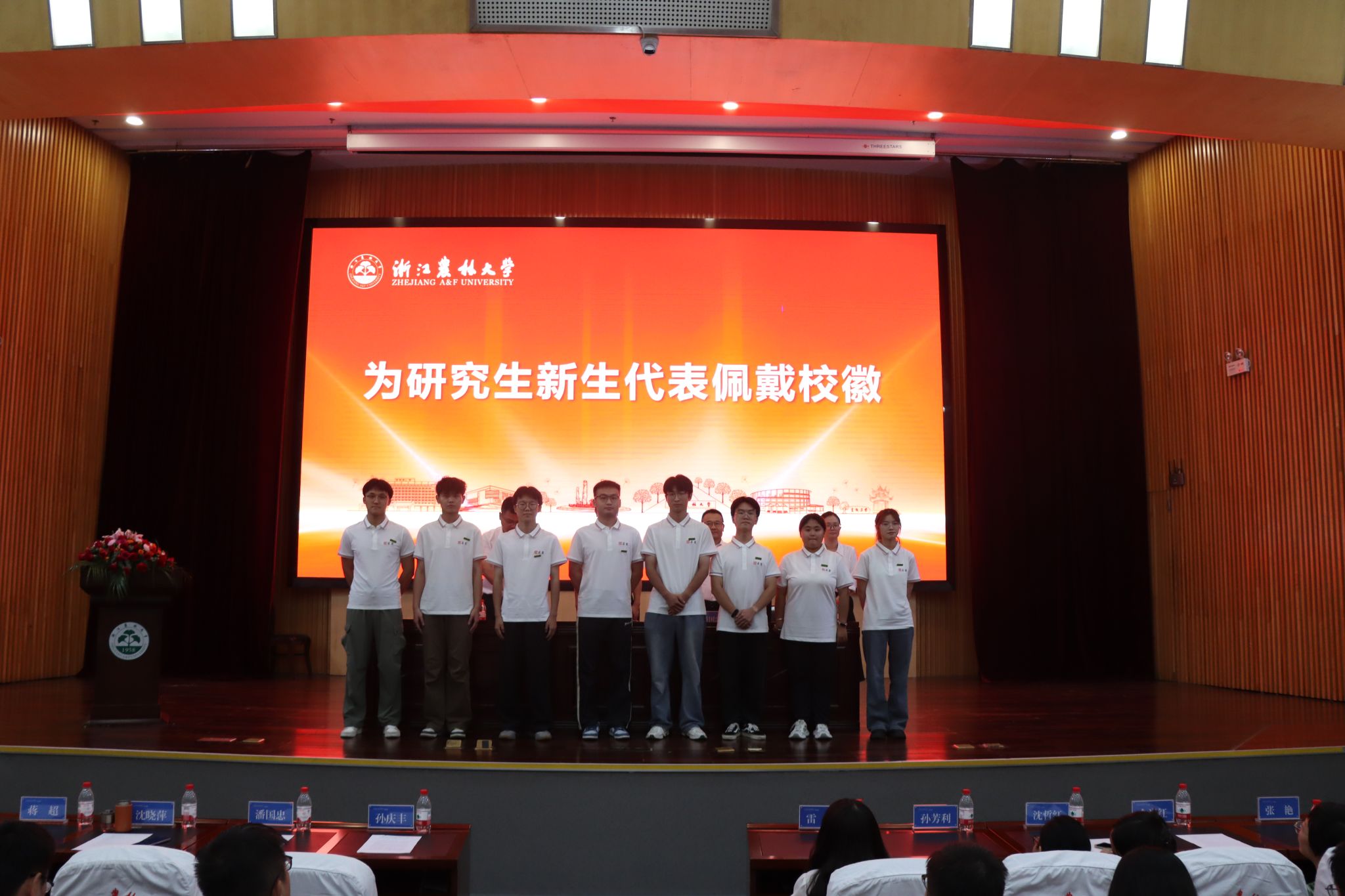 典礼上,公司领导为研究生新生代表佩戴校徽。
