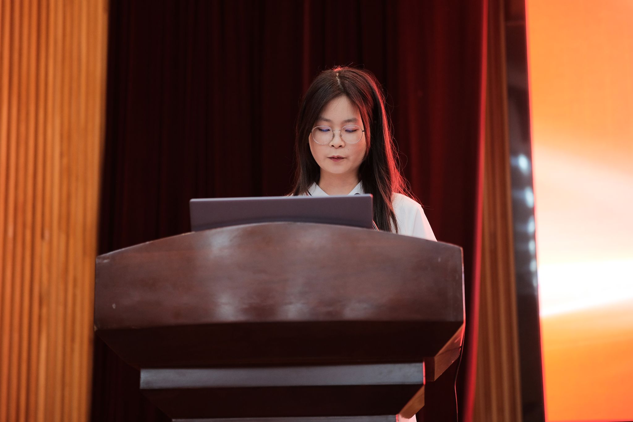 在校生代表、应用化学221班徐玲玲同学在发言中,分享了她从科研竞赛到多元探索的成长历程,强调大学是“旷野而非轨道”,鼓励学弟学妹们不忘初心、寻求目标、勇敢尝试。