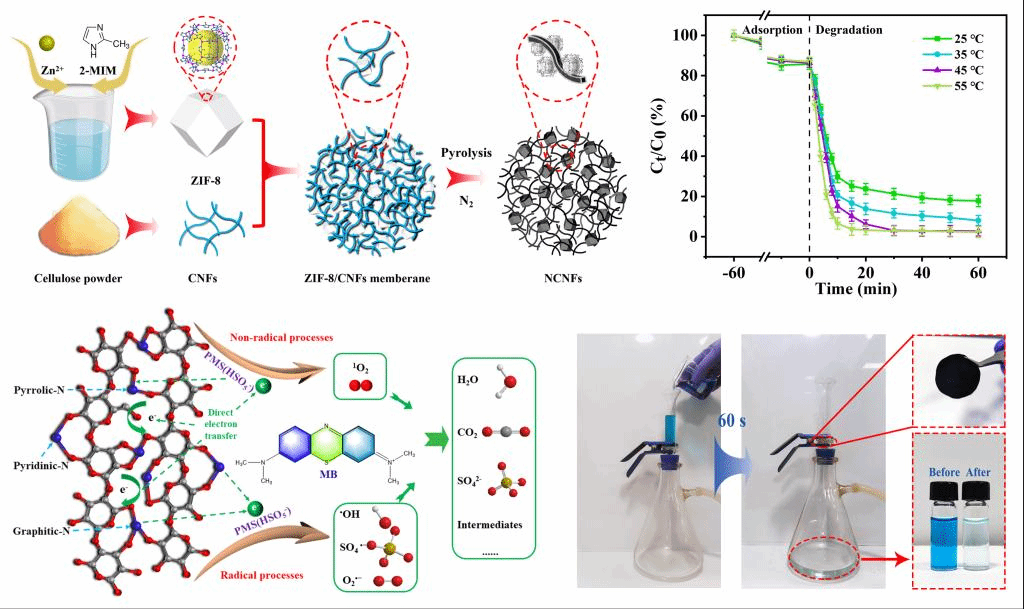 基于过硫酸盐的高级氧化体系(SR-AOPs)是近年来降解各类污染物的研究热点,其中氮掺杂碳材料在SR-AOPs中被认为是一种高效、环保的催化剂。基于此,本课题组率先报告了一种简便的策略,使用纤维素纳米纤维(CNF)和金属有机骨架(MOF)作为SR-AOPs的无金属催化剂前驱体,制备纳米多孔氮掺杂碳纳米过滤器(NCNF)。研究表明,NCNFs膜在降解有机污染物的过程中表现出优异的可重复使用性,可以在实际有机染料修复应用中作为催化过滤器。