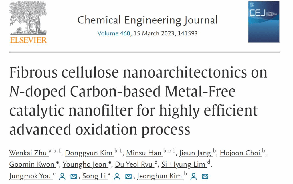 近日,林业工程学科绿色家居材料与创新设计团队青年教师朱文凯以第一作者在工程技术领域国际期刊《Chemical Engineering Journal》上(中科院1区,IF=16.744)发表题为“Fibrous cellulose nanoarchitectonics on N-doped Carbon-based Metal-Free catalytic nanofilter for highly efficient advanced oxidation process”研究论文。通讯作者李松、韩国延世大学Jeonghun Kim教授及韩国庆熙大学Jungmok You教授。