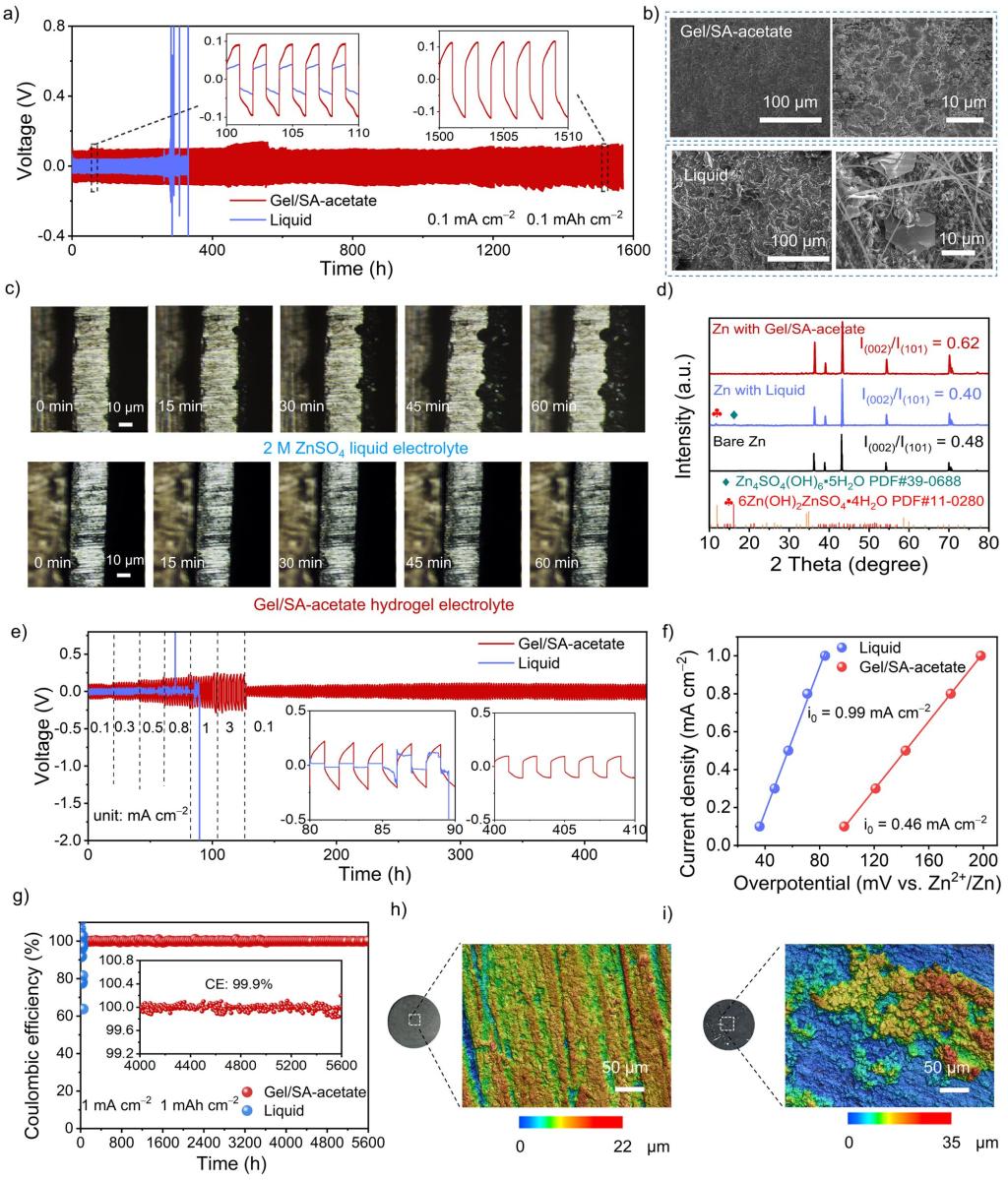 基于该水凝胶电解质组装的Zn||Zn对称电池可以稳定工作1580小时,Zn||Cu不对称电池可以运行超长的5600小时并保持99.9%的平均库仑效率。最终组装的锌离子混合电容器在0.5 A g–1时的最大比容量为236.8 mAh g–1,经15000次循环后容量保持率高达98.5%。该工作为用于开发稳定锌负极的水凝胶电解质提供了一种新策略。