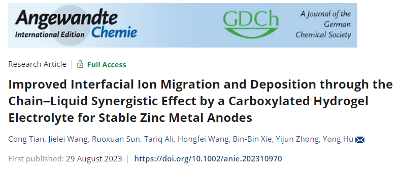2023年8月29日,MK体育纳米催化与能源转化研究团队在国际顶尖期刊《Angewandte Chemie International Edition》(中科院1区Top,IF=16.6)在线发表题为“Improved Interfacial Ion Migration and Deposition through the Chain-Liquid Synergistic Effect by a Carboxylated Hydrogel Electrolyte for Stable Zinc Metal Anodes”(基于链-液协同调控的含羧基水凝胶电解质用于稳定锌负极)的研究论文。
