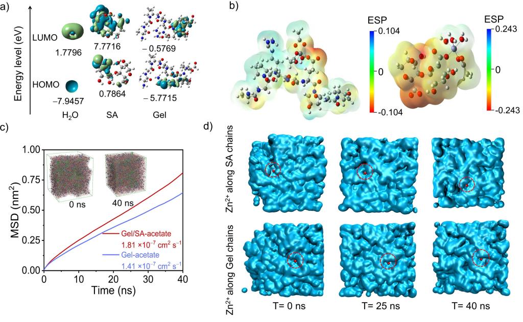 该团队设计了一种新型的含羧基双网络水凝胶电解质用于稳定锌负极界面电化学反应。基于链-液协同调控机制,部分活性水分子从溶剂鞘中被排出,而剩余的配位水分子与羧基官能团形成新的氢键。分子动力学模拟揭示了重构的溶剂化锌离子可以沿聚合物链实现快速定向迁移。所提供的阳离子迁移通道和紧密的界面相互作用可确保高离子电导率(13.6 mS cm–1)以及优越的锌离子转移数(0.68)。此外,制备的水凝胶电解质通过调节电化学界面之间的吸附位点,降低了脱溶剂化能垒并抑制析氢反应,从而实现高效的镀锌/剥离耐久性。