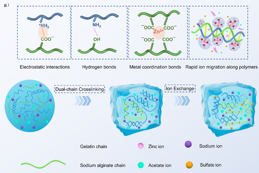 水系锌离子电容器由于安全稳定、容量密度高、充放电速率快等优点,是解决当前能源危机和环境污染的重要储能技术之一。然而,在循环过程中锌金属表面发生的枝晶生长、析氢以及腐蚀等问题阻碍了锌负极在水系储能中的实际应用。近年来,水凝胶电解质由于兼具固态电解质的稳定性和液态电解质的快速离子传输动力学而被研究人员提出以解决上述问题。一些含有阴离子官能团的聚合物网络具有独特的亲锌特性,可以均匀锌离子通量分布并限制锌表面的二维扩散,起到抑制副反应发生的作用。目前,锌离子、水分子和亲水聚合物链之间的相互作用是否对链-液两相间的离子传输机制以及锌沉积行为产生影响还不甚明晰。因此,探索协同调控水凝胶中局部液相组分和限域离子迁移链以保证水凝胶电解质同时具有优异的机械性能、稳定的界面电化学反应和快速的传质过程具有重要的研究价值。