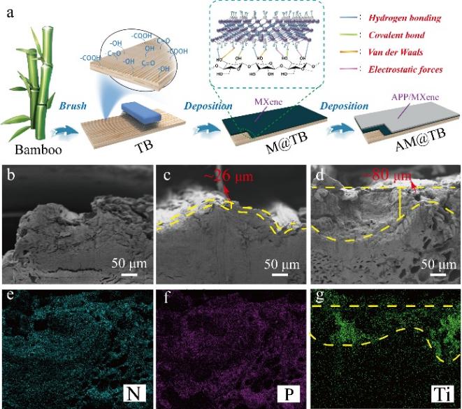 竹材及其制品是我国乡村振兴、碳达峰碳中和等重大战略中备受推崇的特色产品,但其易燃、易霉等固有缺点阻碍了广泛推广应用,这是当前制约竹材工业高质量发表的一大技术瓶颈。为此,杜春贵团队创建了一种低温挥发诱导自组装策略,通过充分发挥Ti3C2Tx(MXene)与预处理竹材(TB)之间的多重相互作用,在不使用胶粘剂的情况下,实现了具有防火、可重复预警与光热杀菌等功能的智能竹材的制备。与普通竹材相比,智能竹材具有优异的阻燃性能:极限氧指数降低65.8%、热释放率降低80.3%、残余物质量增加1.6倍;具有灵敏的火灾响应和重复预警性:响应时间不超过2 s,重复预警次数大于10次;具有出色的光热转换性能,在近红外激光(NIRL)照射后表现出较好的杀菌效果。该项研究为设计和制造兼具阻燃、抗菌、火灾预警预报等功能的生物质材料提供了灵感。
