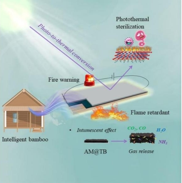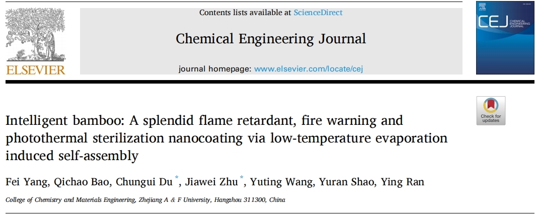 近日,MK体育生物质材料功能性改良与复合技术研究团队在国际知名期刊《Chemical Engineering Journal》(中科院1区Top,IF=15.1)在线发表题为“Intelligent bamboo: A splendid flame retardant, fire warning andphotothermal sterilization nanocoating via low-temperature evaporationinduced self-assembly”的研究论文。MK体育林业工程学科杜春贵教授、青年教师朱家伟为通讯作者,在读博士生杨菲为第一作者。