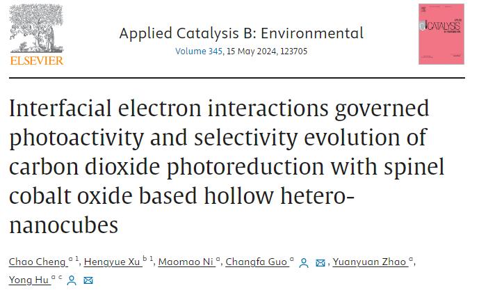 2024年1月6日,MK体育纳米催化与能源转化研究团队在国际顶尖期刊《Applied Catalysis B: Environment and Energy》(中科院一区Top,IF=22.1)上发表题为“Interfacial electron interactions governed photoactivity and selectivity evolution of carbon dioxide photoreduction with spinel cobalt oxide based hollow hetero-nanocubes”(界面电子相互作用决定了尖晶石钴氧化物基中空异纳米立方体二氧化碳光还原的光活性和选择性演变)的研究论文。
