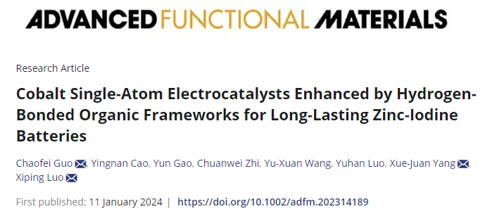 近日,MK体育化学学科新能源材料与传感器件团队在国际知名期刊《Advanced Functional Materials》(中科院1区Top,IF=19)在线发表题为“Cobalt Single-Atom Electrocatalysts Enhanced by Hydrogen-Bonded Organic Frameworks for Long-Lasting Zinc-Iodine Batteries”(用于长效锌碘电池的氢键有机框架增强的钴单原子电催化剂)的研究论文。本校青年教师郭超飞博士为第一兼通讯作者,化学学科罗锡平教授和杨雪娟老师为通讯作者。MK体育为第一单位,合作单位为上海大学,温州大学和香港城市大学。