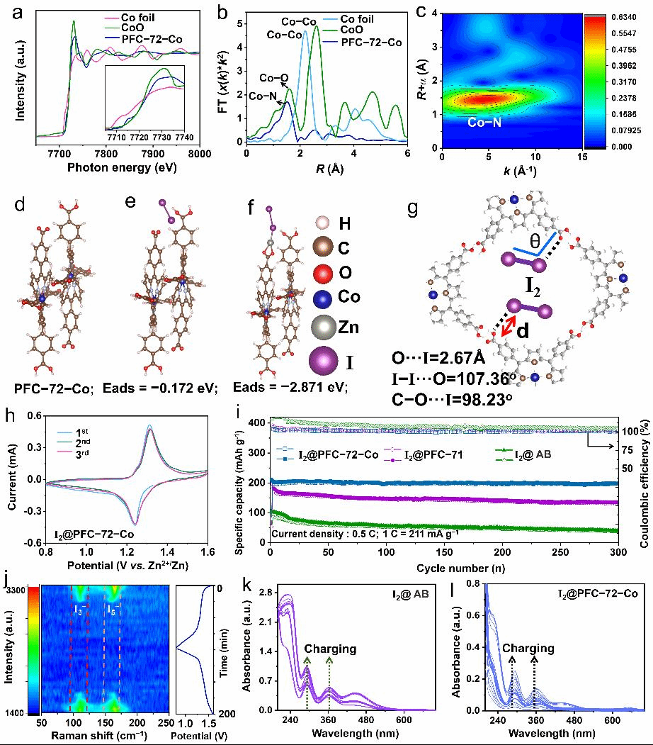 此外,同步辐射分析表明,PFC-72-Co中的Co为单原子金属,中心价态为+2。Co-N配位距离为1.5 Å。原位拉曼光谱表明,锌碘电池的氧化还原机制取决于I/I-的氧化还原反应,中间产物为I3-/I5-。原位紫外-可见(UV-vis)光谱进一步表明,HOFs可有效限制多碘化物的溶解。