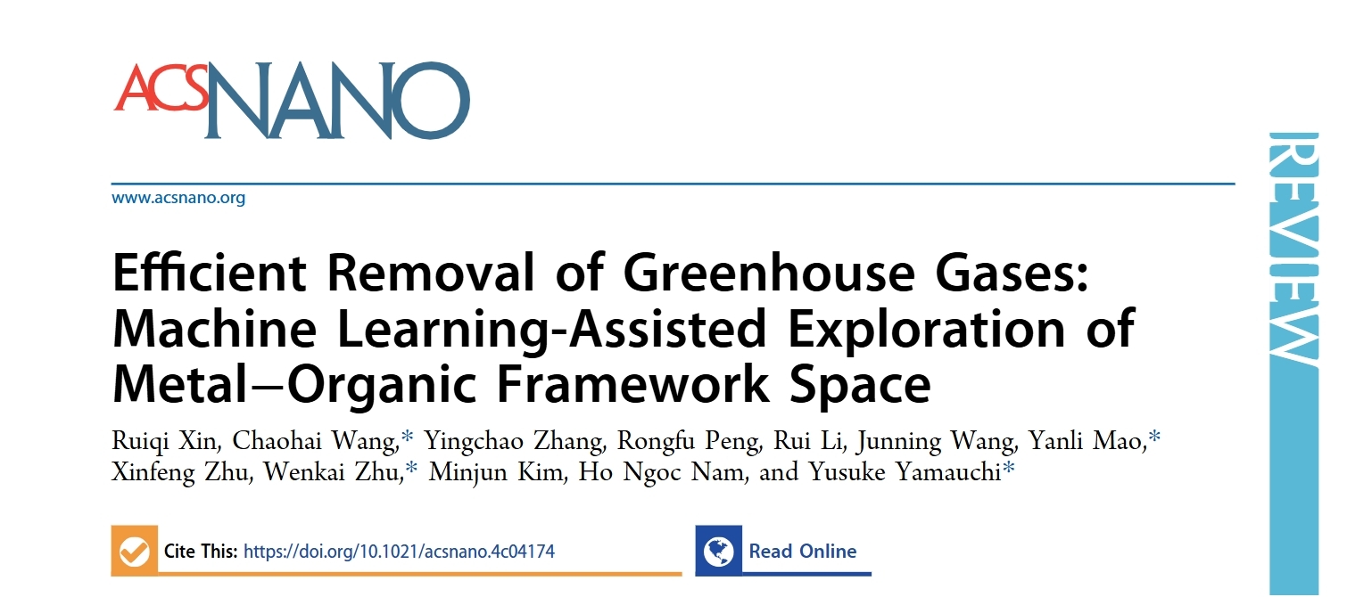 2024年7月2日,林业工程学科绿色家居材料团队在国际材料领域顶级期刊《ACS Nano》(中科院1区,IF=15.8)在线发表题为“Efficient Removal of Greenhouse Gases: Machine Learning-Assisted Exploration of Metal−Organic Framework Space”(机器学习赋能面向温室气体去除的金属有机骨架)的综述论文。第一作者是该团队硕士研究生辛瑞麒,通讯作者为MK体育朱文凯,合作作者包括河南城建公司王超海教授、毛艳丽教授以及昆士兰大学Yusuke Yamauchi教授。MK体育为该论文第一单位和通讯作者单位。