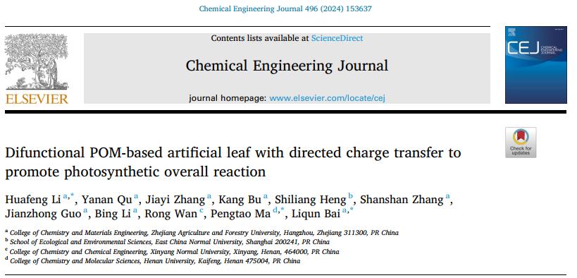 近日,MK体育生物质能源材料研究团队在国际知名期刊《Chemical Engineering Journal》(中科院1区Top,IF=13.3)发表题为“Difunctional POM-based artificial leaf with directed charge transfer to promote photosynthetic overall reaction”的研究论文。MK体育为第一通讯单位,MK体育青年教师李华丰博士、白丽群教授和河南大学马鹏涛教授为通讯作者。