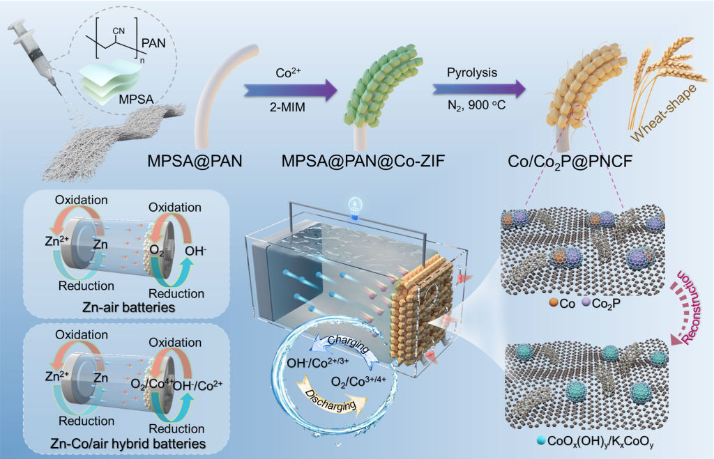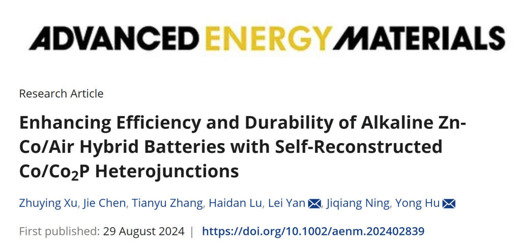 近日,MK体育胡勇教授、颜磊博士等人在国际顶尖期刊《Advanced Energy Materials》(中科院1区Top,IF=24.4)在线发表题为《自重构Co/Co2P异质结构提高碱性Zn-Co/air杂化电池的效率和耐久性》(Enhancing Efficiency and Durability of Alkaline Zn-Co/Air Hybrid Batteries with Self-Reconstructed Co/Co2P Heterojunctions)的研究论文。该工作成功合成了一种类似小麦状的Co/Co2P@PNCF材料,并首次将其作为可充电Zn-Co/air杂化电池的高效自支撑阴极,实现了杂化电池优异的性能输出。论文通讯作者为MK体育胡勇教授,共同通讯作者为颜磊博士。