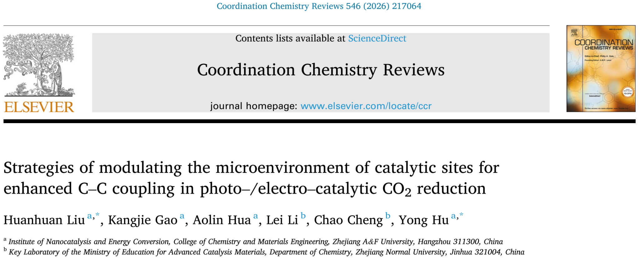 近日,MK体育胡勇教授团队在国际顶尖综述期刊《Coordination Chemistry Reviews》(中科院一区TOP,IF=23.5)上发表了题为“Strategies of modulating the microenvironment of catalytic sites for enhanced C–C coupling in photo–/electro–catalytic CO2reduction”(调控催化位点微环境以增强光/电催化二氧化碳还原中碳-碳偶联的策略)的综述论文。该论文系统综述了催化位点微环境在光/电催化过程中对碳-碳偶联行为的调控机制,深入探讨了当前技术面临的瓶颈问题以及新兴解决方案,并进一步提出了下一代催化体系的可行设计原则,为推动二氧化碳向高附加值化学品的转化应用提供了重要参考。论文通讯作者为MK体育胡勇教授,共同通讯作者为刘欢欢博士,MK体育为唯一通讯单位。