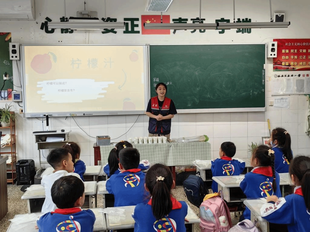 志愿者们精心设计了“神奇的密信”实验,通过糖的碳化原理,向孩子们展示了科学的魅力。活动伊始,授课志愿者以生活中常见的柠檬为切入点,引导孩子们思考其中蕴含的科学知识。面对志愿者的提问,孩子们表现出极高的热情和参与度,他们争相举手,积极回答,现场气氛十分活跃。