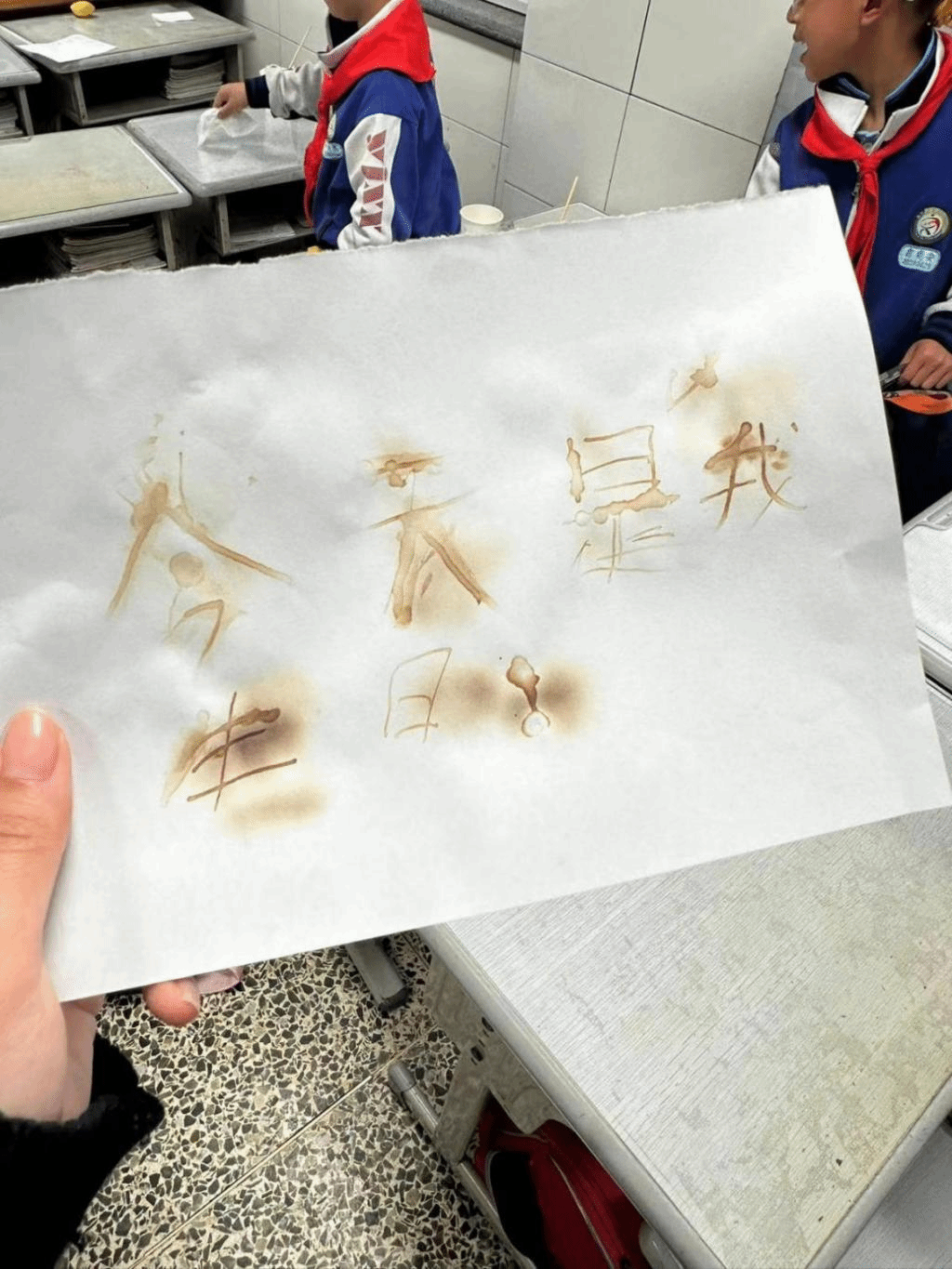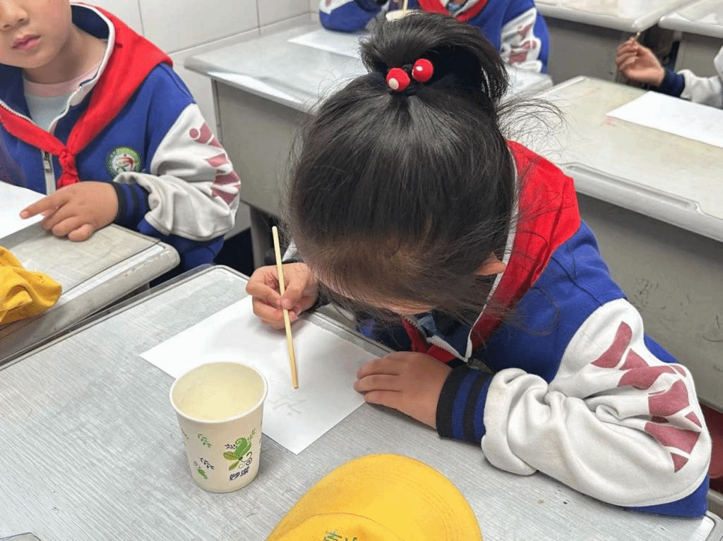 随着实验的展开,同学们用筷子小心翼翼地蘸取柠檬汁,在纸上书写着他们想对朋友、父母或自己说的心里话。柠檬汁的淡淡清香弥漫在空气中,孩子们的脸上洋溢着专注与期待。柠檬汁书写过的字迹在晾干后消失无踪,一张张原本载满童真心语的纸张变得“一尘不染”。